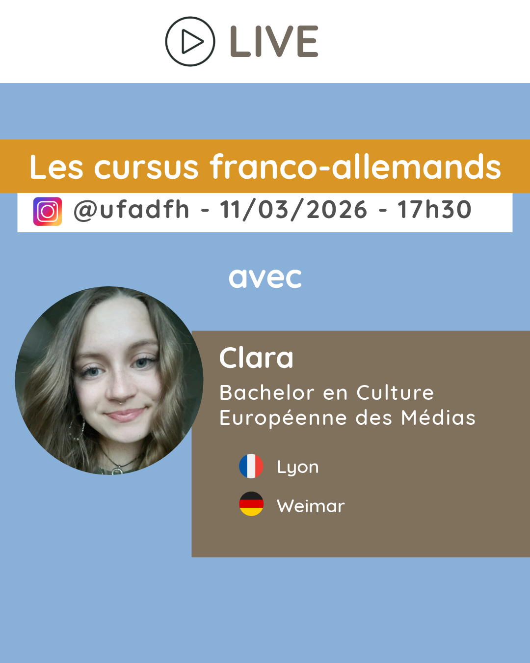Clara, étudiante en licence de culture européenne des médias entre l’Université Lyon 2 et la Bauhaus-Universität de Weimar, présentera le contenu de ses cours, les modalités d’admission, la bourse de mobilité, la recherche d’appartement, ou encore le niveau d’allemand requis pour être sélectionné·e. Le public pourra poser toutes ses questions dans le chat.